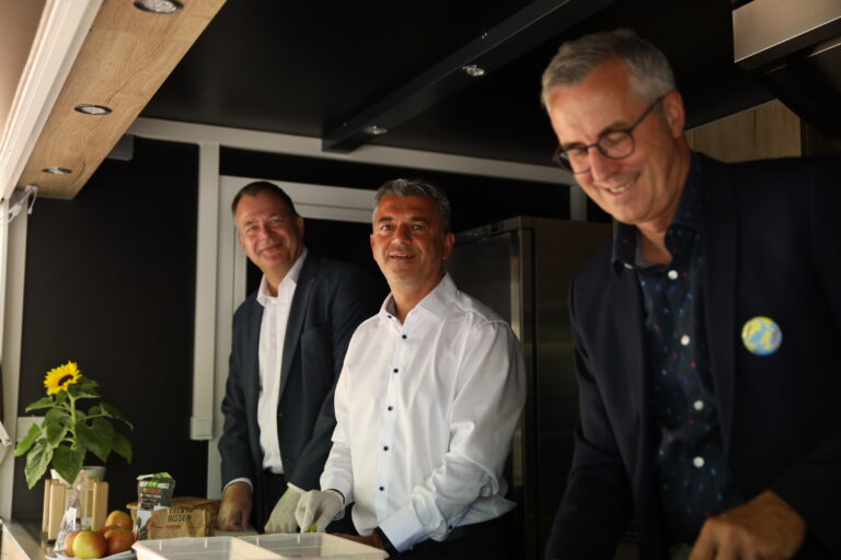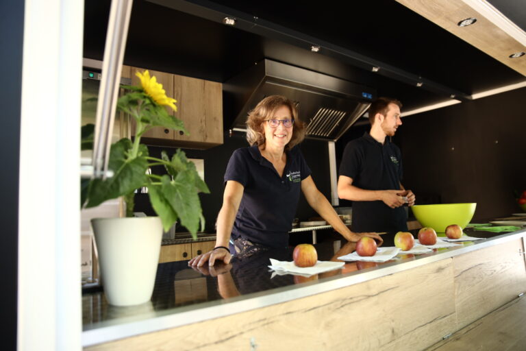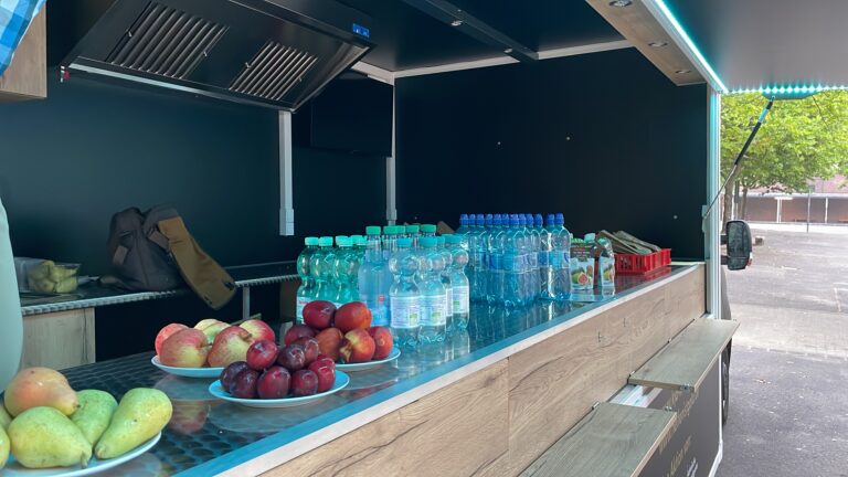 Morgens um 6:30 Uhr wird in unserer Küche fleißig Obst und Gemüse zubereitet. Die leckeren Apfelschiffchen und Gurkenscheiben sind zu Beginn eines Schultages der Renner. Nachdem alles gut und hygienische verpackt ist, geht es mit dem Frühstücksmobil zur Bäckerei, wo frisches Laugengebäck und Brote abgeholt werden. Pünktlich um 7:30 Uhr steht das Mobil auf dem Schulhof und mit ihm die ersten Frühaufsteher. Die ersten Vitamine gehen “über die Theke”. Schnell gesellen sich über 40 Schulkinder dazu und erhalten nicht nur einen Snack, sondern auch oftmals das erste “Guten Morgen” des Tages. Dann schellt es und die ersten beiden Stunden beginnen. Das ist die Zeit, in denen die leckeren Pausenbrote geschmiert werden: Frisches Körnerbrot mit wahlweise Humus oder Käse und einer Tomaten- und Salatscheibe garniert. Diese leckeren Brote finden zusammen mit weiterem Obst und Mineralwasser einen guten Absatz in der ersten großen Pause.
